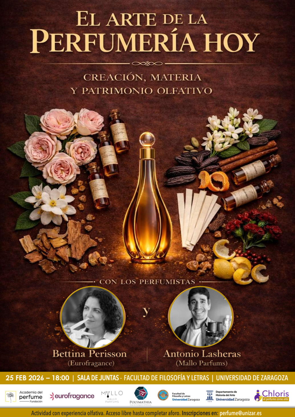 El próximo 25 de febrero de 2026, la Facultad de Filosofía y Letras de la Universidad de Zaragoza acogerá la mesa redonda El arte de la perfumería hoy. Creación, materia y patrimonio olfativo, una actividad enmarcada en el Proyecto de Innovación Docente CHLORIS (PIIDUZ_1_6287), iniciativa interdisciplinar que concibe el perfume como manifestación artística, patrimonio cultural inmaterial y objeto de estudio humanístico y que cuenta con el apoyo de la Academia del Perfume de España.