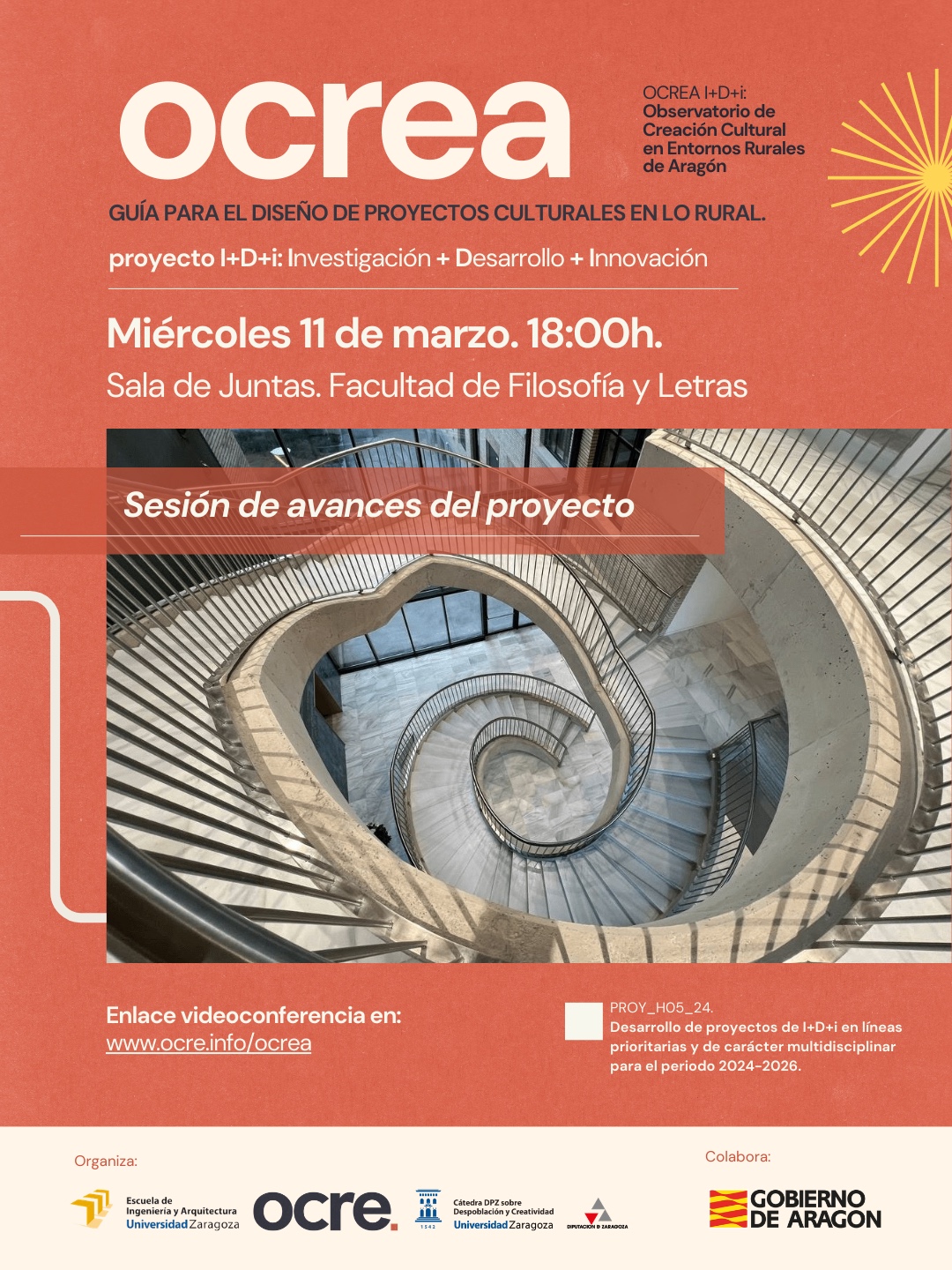 Tras los talleres territoriales en Jaca, Cariñena y Alcañiz, os invitamos mañana miércoles 11 de marzo a la sesión de avances del proyecto OCREA I+D+i, orientado al diseño de una guía pública que facilite, desde fases iniciales, los proyectos culturales en el rural aragonés.